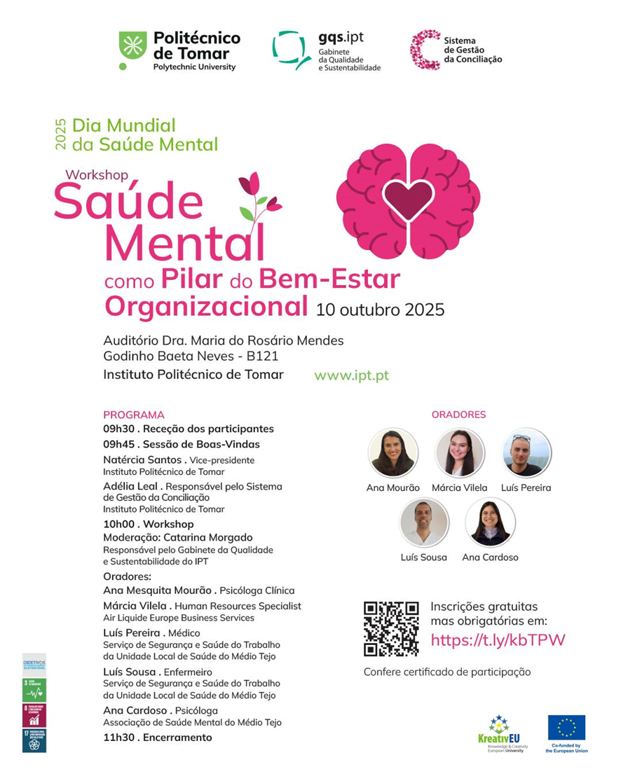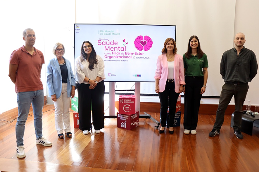 O Politécnico de Tomar assinalou o Dia Mundial da Saúde Mental com a promoção do workshop “Saúde Mental como o Pilar do Bem-Estar Organizacional”. O evento contou com presença de estudantes, docentes e funcionários, bem como comunidade em geral, numa sessão bastante dinâmica e participada, sublinhando a importância da temática da saúde mental e da implementação de boas práticas para o bom funcionamento das organizações e melhorar a qualidade de vida dos colaboradores.